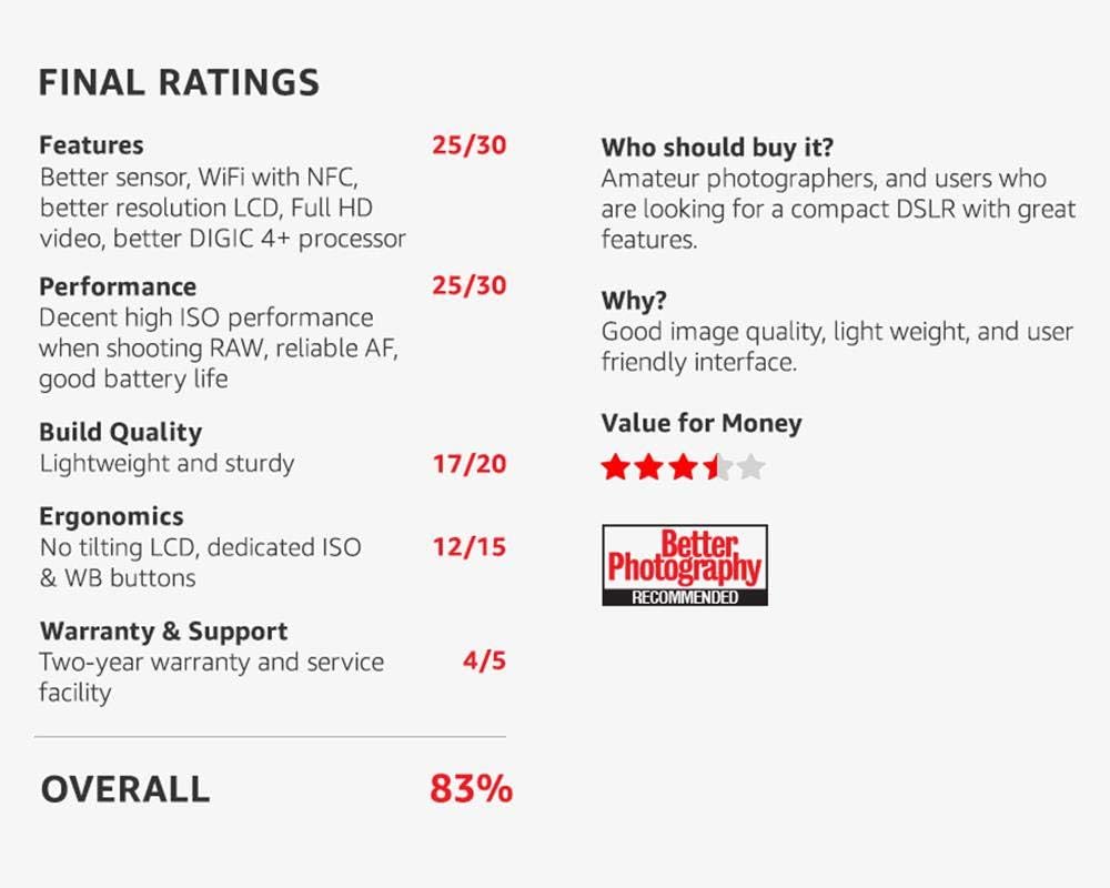Additional Features 24.1MP APS-C CMOS sensor, DIGIC 4+ image processor, 9-point AF with 1 center cross-type AF point, Standard ISO 100 - 6400 (expandable to 12800), Wi-Fi / NFC supported, Wi-Fi / NFC-Easy pairing with smartphones, printers and other devices, 63-zone TTL open-aperture metering, Compatible with EX-series Speedlites, Canon EF lenses (including EF-S lenses) compaitable