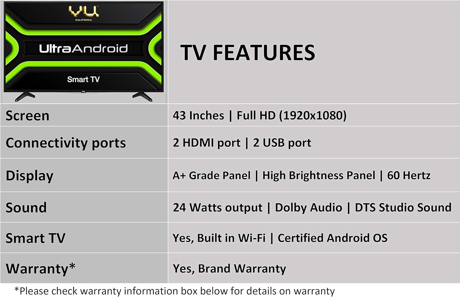 Warranty Information: 1 year warranty provided by Vu from date of purchase